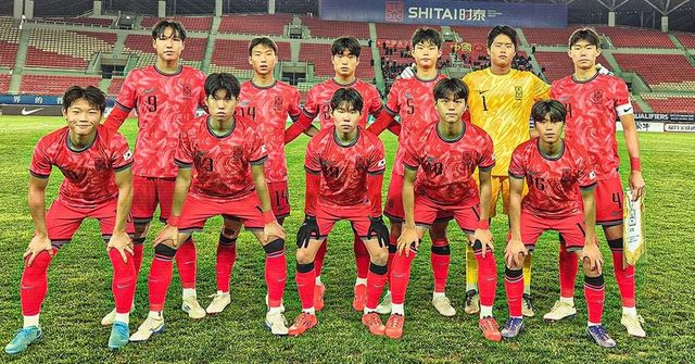 27일 중국 다롄의 푸완스타디움에서 열린 2025 아시아축구연맹(AFC) U-17 아시안컵 예선 C조 마지막 경기에서 중국과 2-2로 비긴 16세 이하(U-16) 축구대표팀. / 대한축구협회 인스타그램