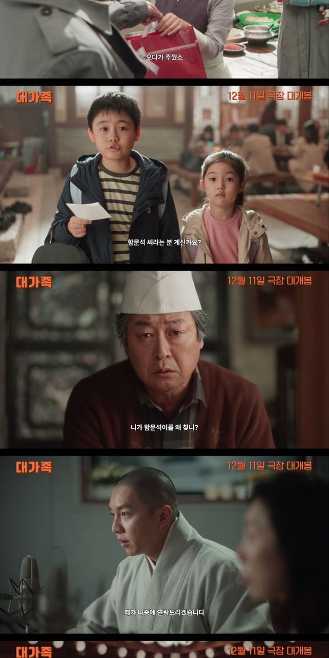 오늘 함께 공개한 티저 예고편에서는 양우석 감독의 진정성 있는 연출과 함께 영화의 유쾌한 분위기를 확인할 수 있다. 예고편은 줄이 끊이지 않는 노포 맛집 평만옥을 운영하는 함무옥(김윤석)을 비추고 승려가 된 아들 함문석(이승기)의 라디오 생방송 장면으로 이동한다. 방송 중 주지스님 함문석에게 자식이 찾아왔다는 사실이 전국에 생중계되면서 ‘대가족’의 파란만장한 스토리가 시작된다. 만두 맛집 사장님으로 변신한 김윤석과 삭발을 감행한 이승기의 케미스트리가 벌써부터 기대를 모은다. 여기에 김성령, 강한나, 박수영과 아역 배우 김시우, 윤채나까지 와글와글한 배우들의 호흡은 올겨울 극장가에서 꼭 만나봐야 할 꽉 찬 영화의 재미를 예고한다.