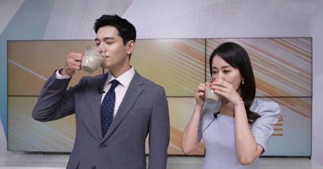 남녀 아나운서가 시사 프로그램 진행 도중 나란히 음료 마셨다가...