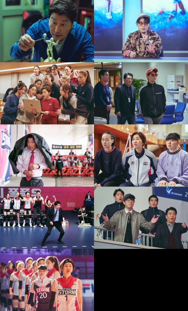 공개된 보도스틸은 부서진 트로피를 복원하기 위해 심혈을 기울이고 있는 백전백패 감독 ‘김우진’(송강호 분)부터 해체 직전 여자배구단 ‘핑크스톰’을 사들인 후 방송에 출연해 파격 공약을 내세우는 관종 구단주 ‘강정원’(박정민 분), ‘핑크스톰’ 뉴스에 일희일비하는 선수들까지 심상치 않은 팀 ‘핑크스톰’의 모습이 눈길을 사로잡는다. 시즌 통틀어 단 한번만 이기면 20억원을 뿌리겠다는 구단주의 선언에 단숨에 화제의 배구단이 된 ‘핑크스톰’. 하지만 형편없는 경기 실력에 연패 행진을 이어나가고, 이에 분노하는 팬들을 피해 경기장을 빠져나가는 ‘김우진’의 모습이 짠한 웃음을 자아낸다.