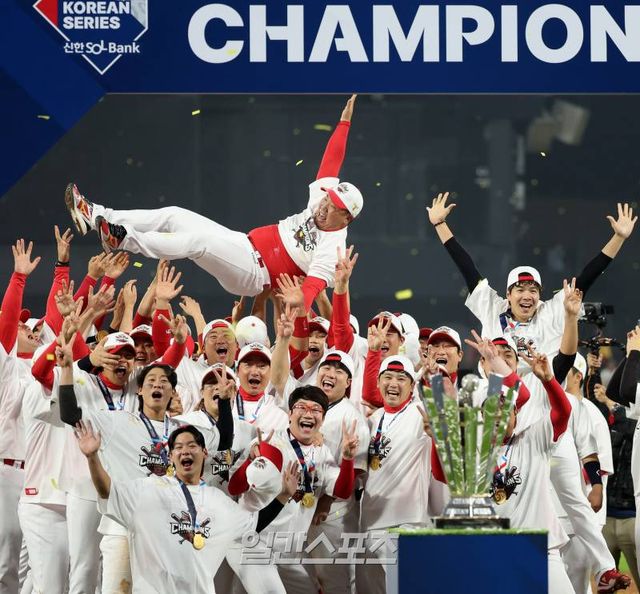 2024 프로야구 KBO 포스트시즌 KIA 타이거즈와 삼성 라이온즈의 한국시리즈(KS)는 시리즈 전적 4승 1패로 KIA의 통합우승으로 끝났다. 28일 광주 기아챔피언스필드에서 열린 5차전 이후 진행된 시상식을 마치고 선수들이 이범호 감독을 헹가래하하고 있다. 광주=김민규 기자 /2024.10.28/