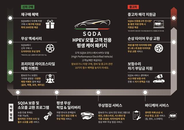 아울러 SQDA 고객은 전용 서비스센터에서 사고 차량에 대한 보험수리 시 자기부담금(면책금)을 지원받을 수 있으며, 파스 손상 등으로 인해 재생이 불가한 타이어는 연 1회 동종 타이어 1개로 무상 교환이 가능하다. 이 외에도 보유하고 있는 중고 차량을 국내 유일의 람보르기니 인증중고센터에 판매할 경우 지원금을 지급하는 등 고객에게 실질적인 혜택을 제공하는 다양한 서비스가 포함돼 있다.