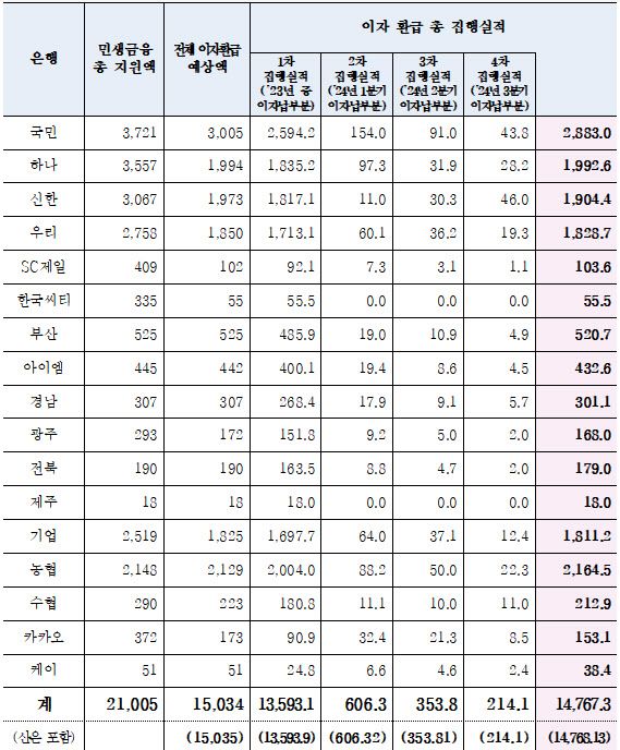 은행권의 전체 이자환급 예상액은 1조5034억원이다. 은행권은 개인사업자대출 차주가 4분기 납부한 이자에 대해서는 내년 1월 환급할 예정이다.