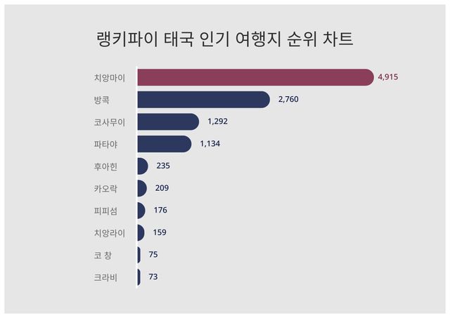 차트를 살펴보면 치앙마이가 4,915포인트로 해당 부문 1등을 기록했다. 바로 뒤 방콕이 2,760포인트로 2등을 차지했다.