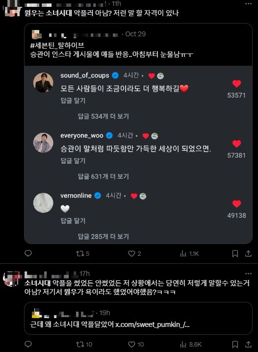 [아이뉴스24 설래온 기자] 과거 소녀시대에게 악플을 남겼던 세븐틴 원우가 '아이돌에게 상처를 주지 말라'는 같은 멤버의 글에 "따뜻한 세상이 됐으면"이라는 댓글을 달았다. 이에 많은 누리꾼은 그의 이중성을 꼬집고 있다.