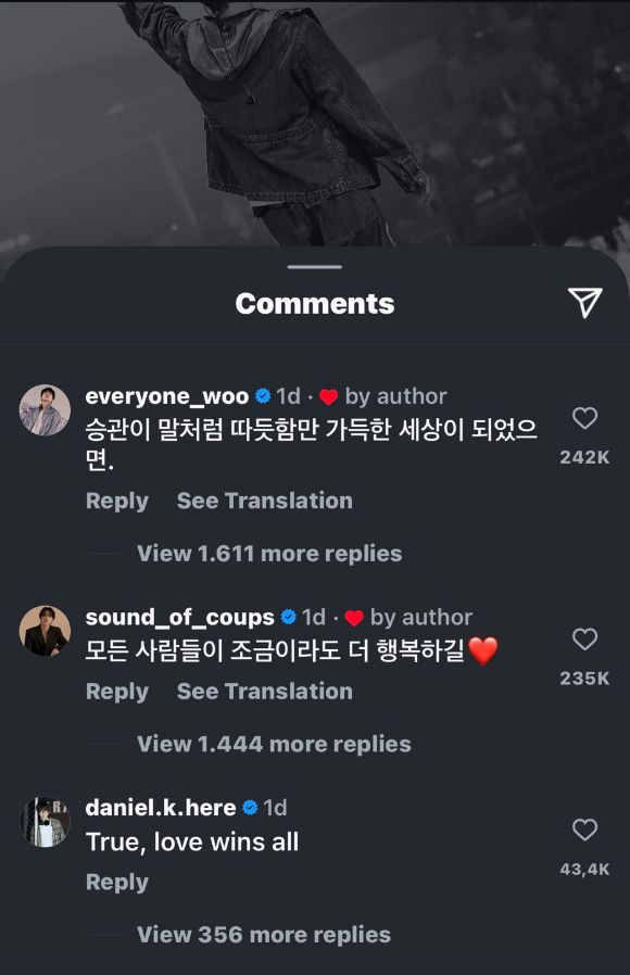 이를 응원하는 취지에서 같은 그룹 멤버들이 해당 게시물에 댓글을 남겼고, 그중 원우가 "승관이 말처럼 따뜻함만 가득한 세상이 됐으면"이라고 적은 댓글이 일부 누리꾼 사이에서 비판을 받았다.