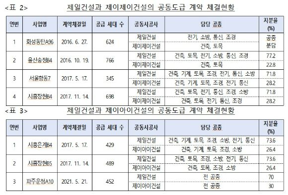 이로 인해 제이제이건설은 2016~2020년에 1574억 원의 시공 매출과 138억원의 시공이익을 얻었다. 총 시공 매출에서 위반을 통해 얻은 시공매출 비중은 83.3%에 달했다. 제이아이건설은 2017~2023년에 848억원의 시공 매출과 107억원의 시공이익을 냈다. 이 회사 총 시공 매출의 49.3% 수준이었다.