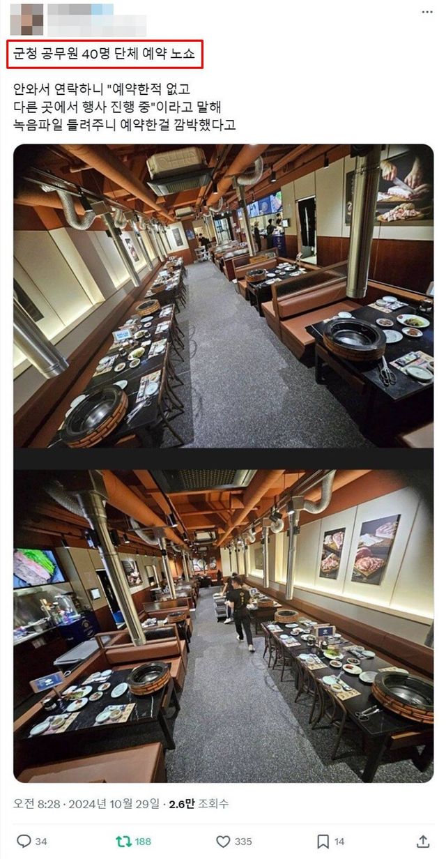 군청 공무원 40명 단체 예약 노쇼 사실이 제보된 엑스. / 엑스