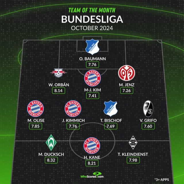 축구 통계 매체 후스코어드닷컴은 지난 29일 2024~25 분데스리가 10월의 팀을 공개했다. 매체는 10월 분데스리가 3경기 이상 소화한 선수 중, 높은 평점을 받은 이들로 라인업을 꾸렸다.
