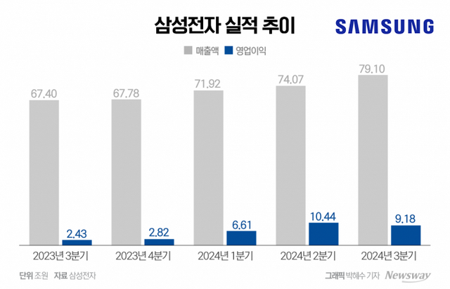 30일 삼성전자는 2024년 3분기 매출 79조1000억원, 영업이익 9조1800억원을 기록했다고 밝혔다. 전년 동기 대비 각각 17.3%, 278% 증가한 것으로 매출은 역대 최대 분기 최대치를 달성했다. 다만 전 분기와 비교하면 영업이익은 12% 감소한 것으로 집계됐다.