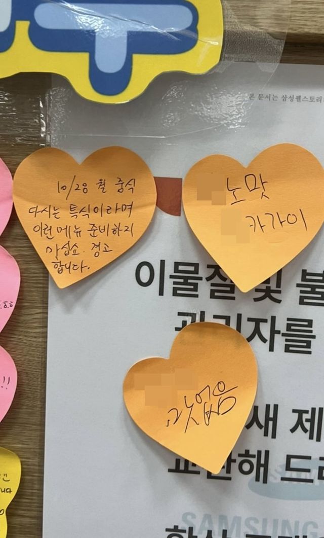 SNS에 퍼진 사진에는 "X노맛", "다시는 특식이라며 이런 메뉴 준비하지 말아라 경고한다", "XX 맛없음" 등 욕설과 막말이 적힌 포스트잇 여러 장이 한 식당 게시판에 붙어 있는 모습이 담겨 있다.