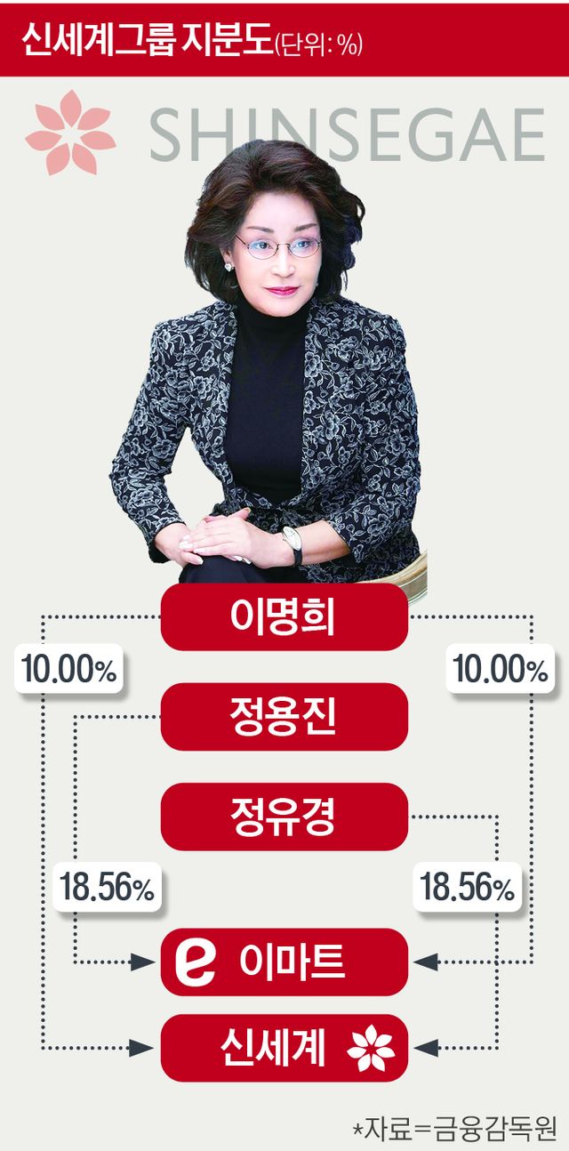 신세계그룹의 경우 이명희 총괄회장의 20여년간 순차 증여와 주식 교환 등을 통해 이마트와 신세계가 계열사를 양분하는 구조를 이미 만들었다. 이마트와 신세계 지배구조를 보면 정용진 신세계그룹 회장과 정유경 회장이 각각 이마트 지분 18.56%, 신세계 지분 18.56%를 보유한 최대주주로 있다.