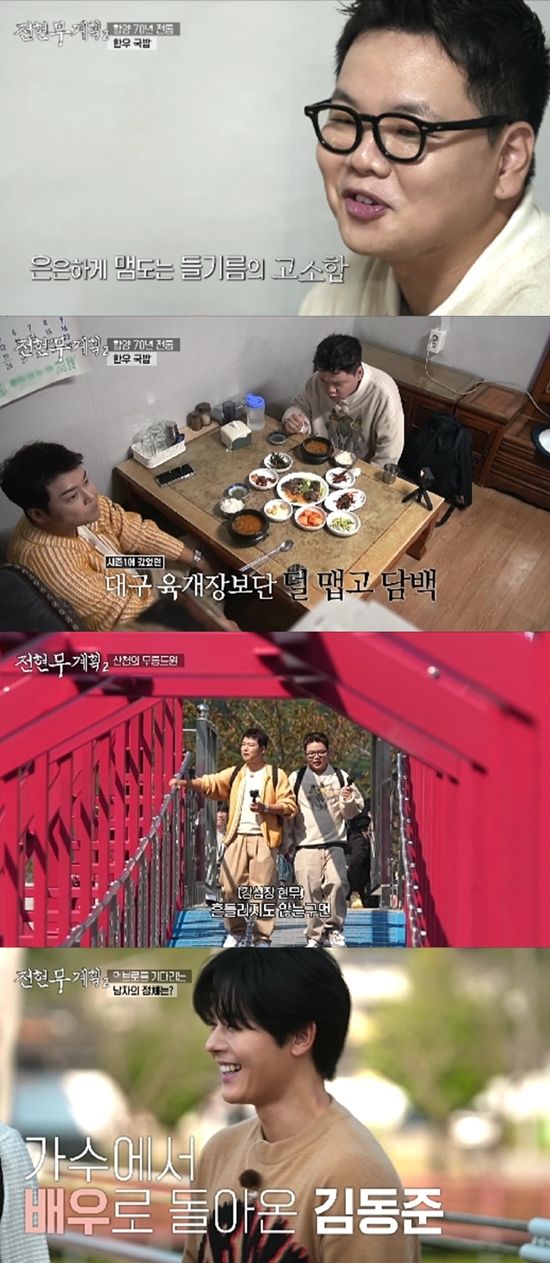 한우 국밥을 맛있게 ‘완뚝’한 두 사람은 경남 산청군으로 이동했다. 산청에서 전현무는 “무릉도원으로 가자!”라고 흔들다리인 ‘무릉교’로 곽튜브를 이끌었다. 곽튜브는 “이건 너무하다”며 고소공포증을 호소했으나, 오직 앞만 보고 다리를 걷기 시작해 짠내웃음을 안겼다. 곽튜브의 비명이 난무한 가운데, 전현무는 “계곡도 좀 봐~”라며 여유를 부렸고, 곽튜브는 “나중에 ‘전현무계획2’ 방송으로 볼게요”라고 다급하게 받아쳐 ‘대환장 파티’를 이뤘다.