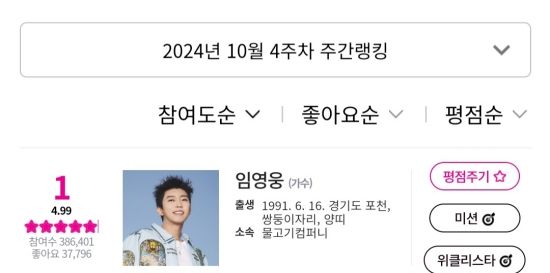 아이돌차트는 10월 25일부터 10월 31일까지 집계된 10월 4주 차 평점랭킹에서 임영웅이 38만 6,401표를 얻어 최다득표를 기록했다고 밝혔다. 이로써 그는 아이돌차트 평점랭킹에서 188주 연속 1위를 기록하게 됐다.