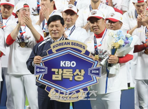 2024 신한 쏠뱅크 KBO 한국시리즈 5차전 삼성과 KIA의 경기가 28일 오후 광주 기아챔피언스필드에서 열렸다. KIA가 7-5 승리하고 우승을 차지했다. 우승 행사에서 이범호 감독이 감독상을 받고있다. 광주=정시종 기자 /2024.10.28.