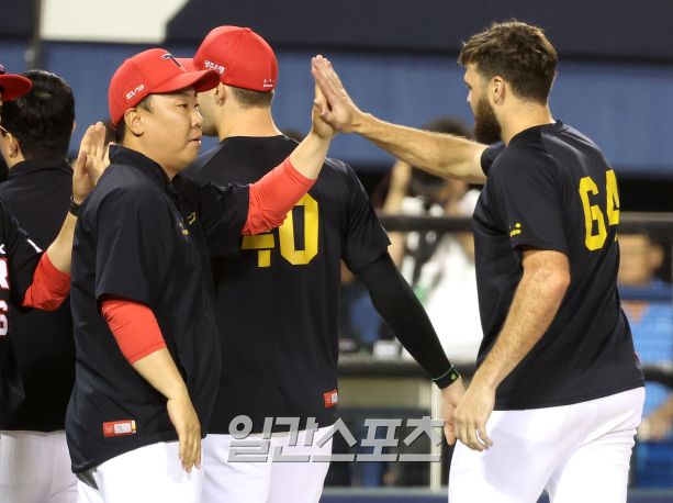 2024 KBO리그 프로야구 LG 트윈스와 KIA 타이거즈의 경기가 11일 오후 서울 잠실야구장에서 열렸다. 4대 2로 승리, 6연승을 거둔 KIA 이범호 감독이 경기 후 선발 알드레드 등 선수들을 맞이하고 있다. 잠실=김민규 기자 /2024.07.11/