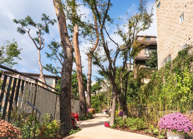 등교길에는 계절의 변화를 느낄 수 있도록 상록수와 함께 수국, 황매화, 남천, 화살, 라일락 등 다양한 관목을 식재했다. 또한, 감나무, 매화나무, 자두나무 등 유실수를 심어 자연 학습 효과를 높였으며 뜨거운 햇살을 피할 수 있는 휴식 공간도 마련했다.