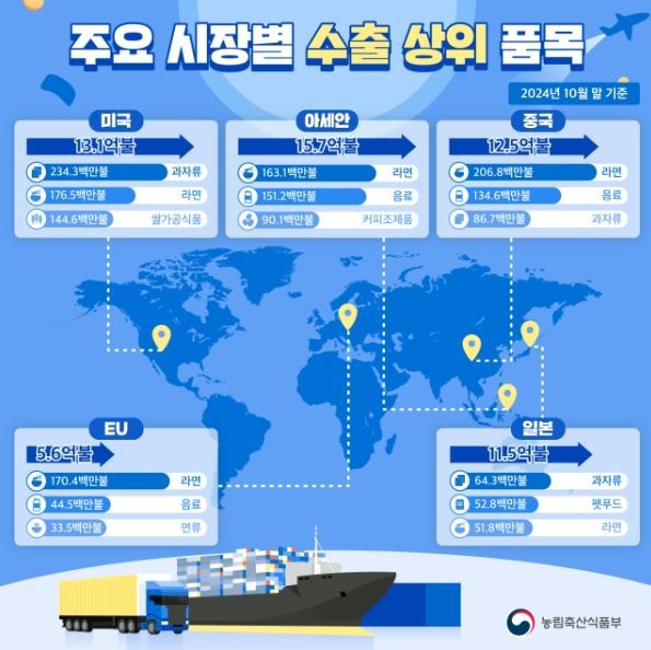 수출시장별로는 미국, 유럽이 전년동기대비 20% 넘는 증가세를 보이고 있고, 중국과 아세안도 지속 성장하고 있다. 농식품부는 미국, 중국, 일본에 집중된 수출시장 확대를 위해 세계 인구의 30%가 거주하는 중동, 중남미, 인도라는 3대 신시장에 대한 홍보, 마케팅 등을 강화했다.