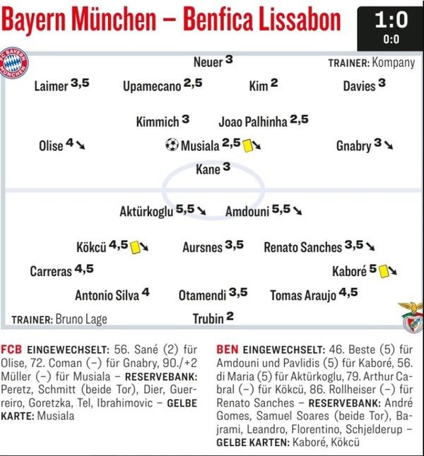 김민재 등 수비진의 맹활약 덕분에 바이에른은 이날 슛을 단 1개 허용했다. 김민재의 파트너 수비수 다요 우파메카노, 앞에서 저지선 역할을 해 준 미드필더 주앙 팔리냐도 2.5점으로 좋은 점수를 받았다. 이는 선제결승골을 넣은 자말 무시알라와 같은 점수였다.