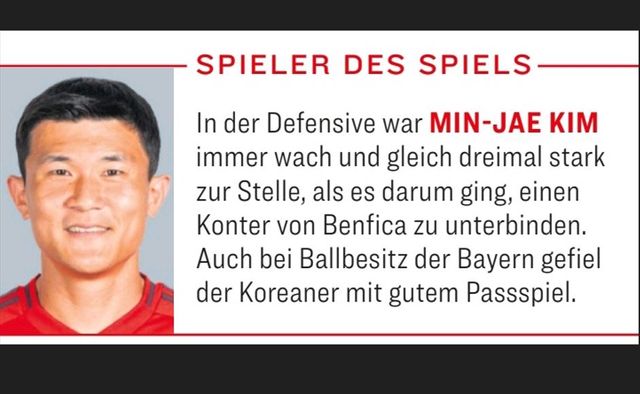풀타임 활약한 김민재는 이 매체로부터 경기 최우수 선수로 선정됐다. 김민재는 평점 2점을 받았는데 이날 팀내 최고점이었고, A학점에 해당하는 좋은 점수다. 또한 ‘수비에서 김민재는 항상 경계심을 유지하면서 벤피카의 반격을 세 차례나 막아냈다. 이 한국 선수는 바이에른이 공을 가졌을 때도 좋은 패스로 활약했다’는 평가가 따랐다.
