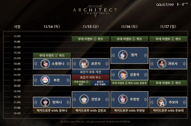 11월 16일 토요일에는 김종국과 릴카, 우정잉 등이 직접 '아키텍트'를 소개하고 플레이하는 등 자리를 마련할 예정이다.