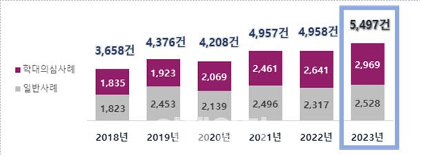7일 보건복지부와 중앙장애인권익옹호기관이 공개한 ‘2023 장애인학대 현황보고서’에 따르면 전체 신고건수는 5497건으로 전년 대비 10.9% 증가했다. 2018년 첫 조사때 3658건이었던 것이 이후 4000건대에서 꾸준히 유지되다 지난해 처음으로 5000건을 넘은 것이다. 이중 학대 의심사례는 2969건(54.0%)으로 전년 대비 12.4% 증가했다. 학대의심사례에 대한 판정결과도 학대 1418건(47.8%)으로 전년 대비 232건(19.6%) 증가했다.