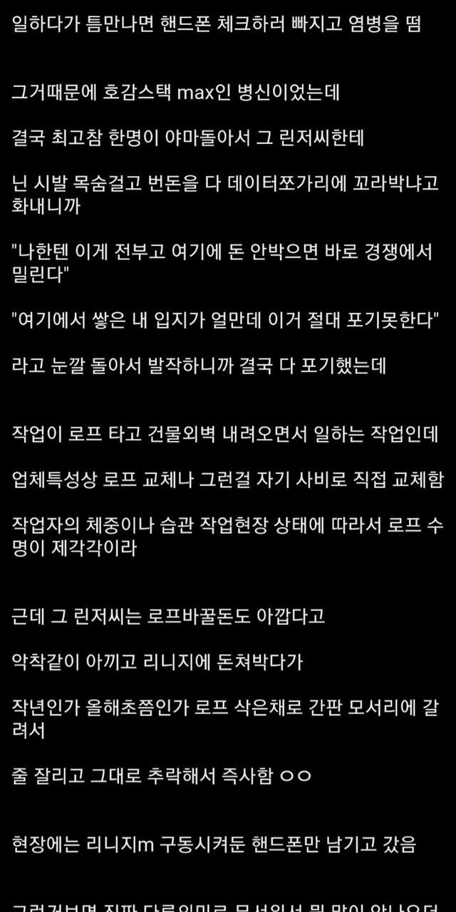 친지중에 초고층건물 전문 외벽보수업체에서 일하시는분 있음 목숨건만큼 수익이 높은건 당연한건데 작업 인원중에 린저씨가 하나 섞여있었음 새벽부터 일하러와서 핸드폰 2개 들고와서 대용량 보조배터리 꽂아놓고 2개로 리니지모