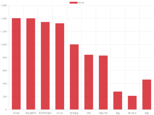 대덕(008060)은 인지도 지수 3.2점, 대동기어(008830)는 3.15점, 경농(002100)은 1.05점, 에너토크(019990)는 0.8점, 세동(053060)은 1.75점의 인지도 지수를 보이고 있다.