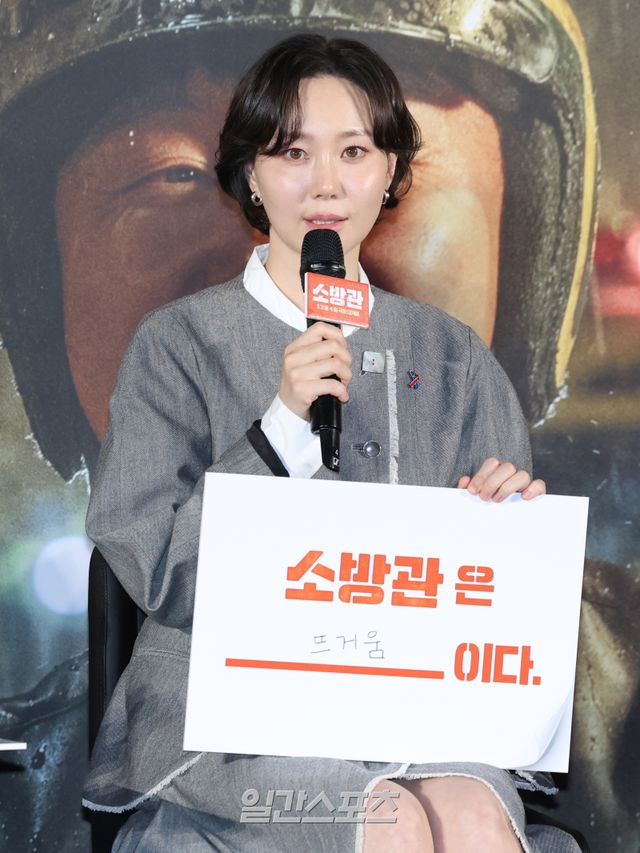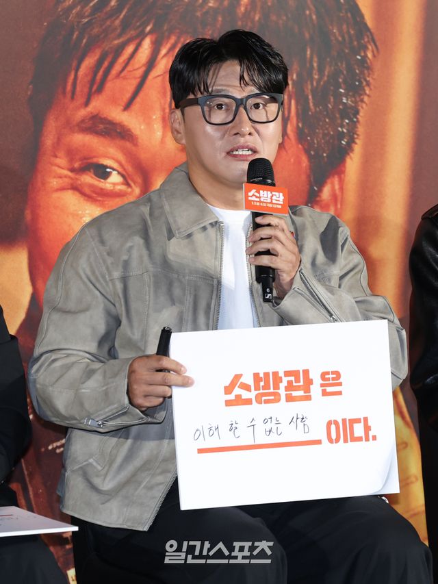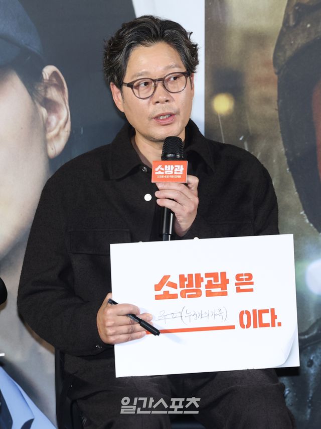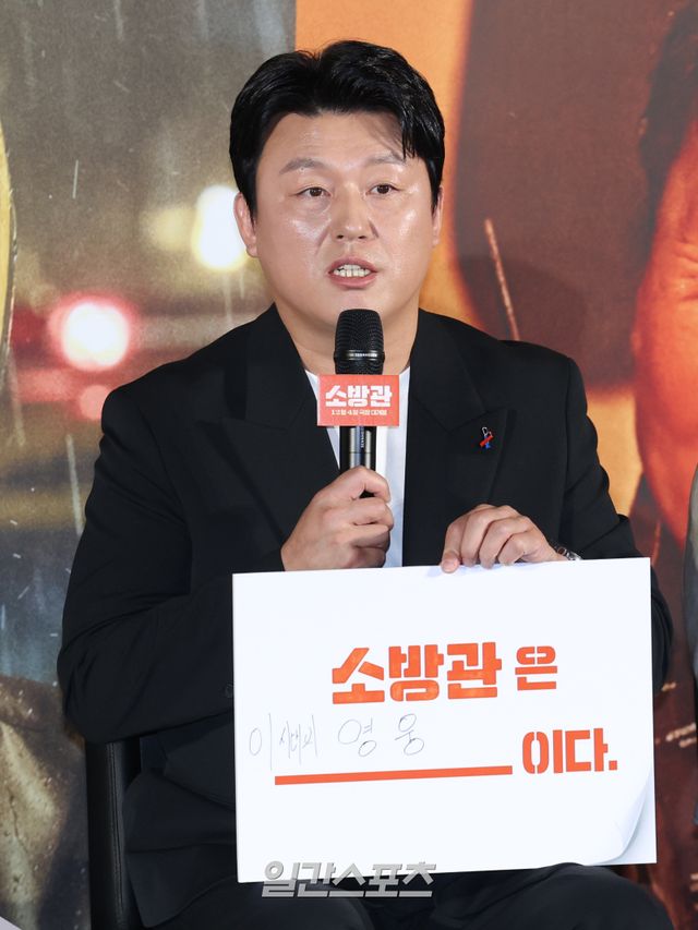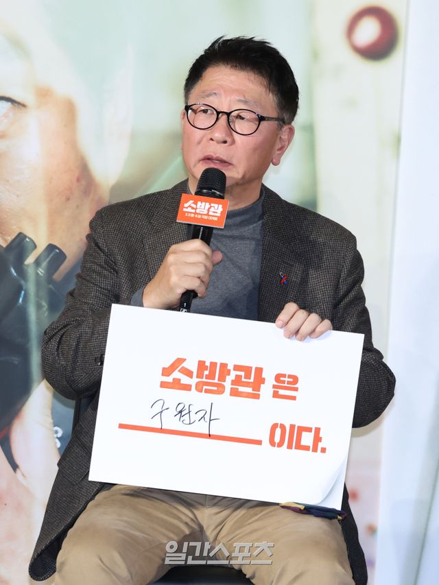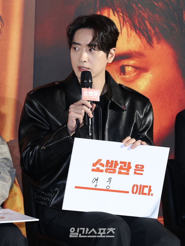 주역들이 8일 오전 서울 용산구 용산CGV아이파크몰에서 열린 영화 '소방관' 제작보고회에 참석해 '소방관'에 대해 이야기 하고 있다.