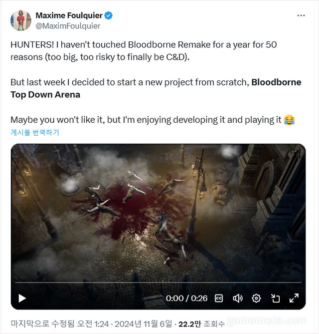 ▲ 블러드본: 탑 다운 아레나 개발 발표 (자료출처: 막시마 풀키에 X)