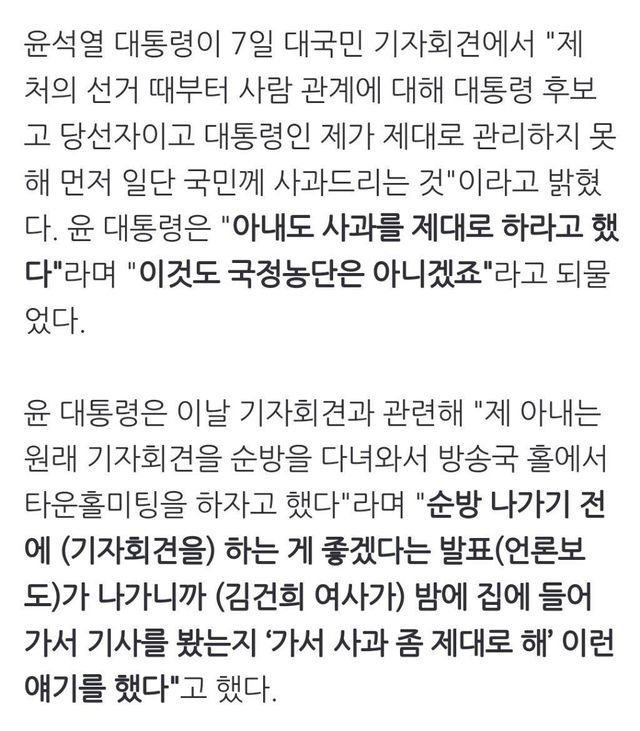 윤석열 대통령이 7일 대국민 기자회견에서 "제 처의 선거 때부터 사람 관계에 대해 대통령 후보고 당선자이고 대통령인 제가 제대로 관리하지 못해 먼저 일단 국민께 사과드리는 것"이라고 밝혔