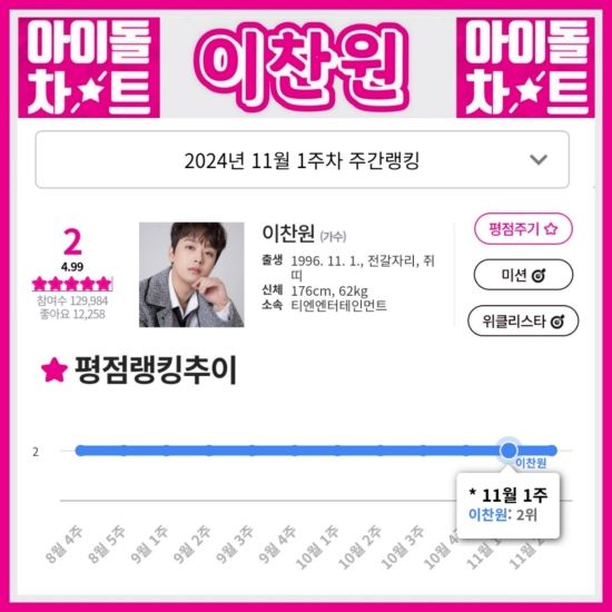 (엑스포츠뉴스 이정범 기자) '찬또배기' 이찬원이 11월 1주 차 아이돌차트 평점 랭킹 2위에 올랐다.