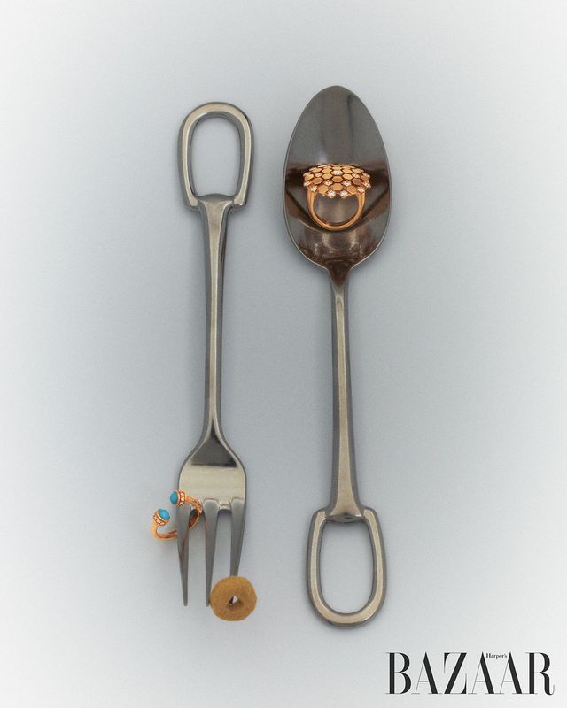 양끝에 2개의 튀르쿠아즈 카보숑이 장식된 ‘포제션 오픈’ 링은 Piaget. 로즈 골드에 19개의 다이아몬드가 세팅된 ‘비 마이 러브’ 링은 1천만원대 Chaumet. 커트러리는 Hermès.
