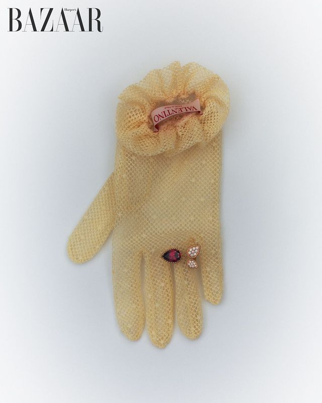 페어 컷 로돌라이트 가닛과 16개의 다이아몬드가 장식된 ‘쎄뻥 보헴 로돌라이트 트리플 모티브’ 링은 1천만원대 Boucheron. 레이스 장갑은 61만원 Valentino Garavani.
