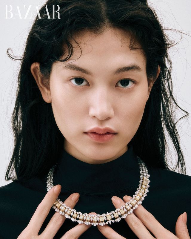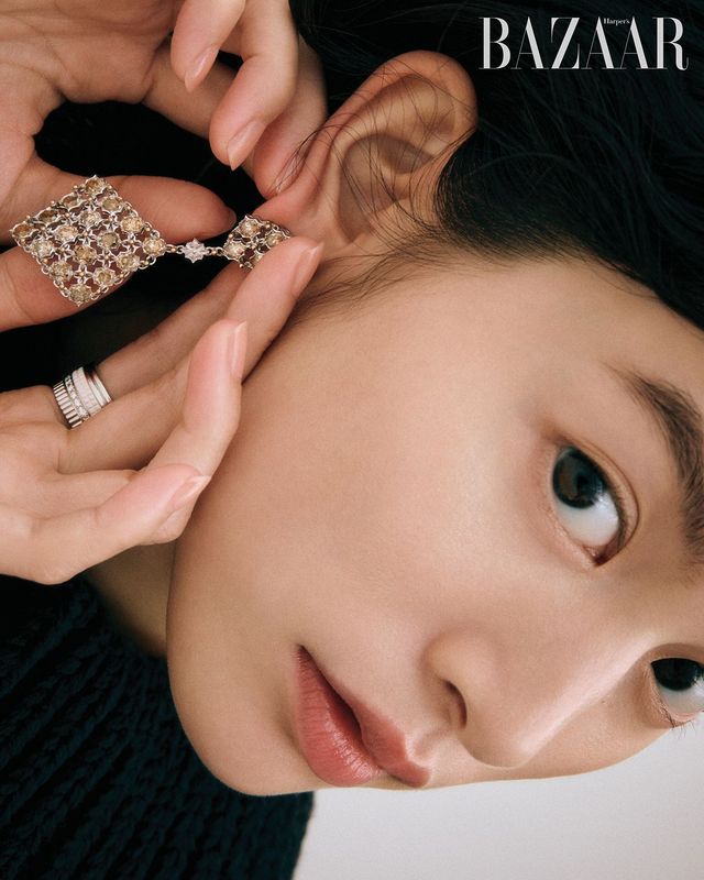 검지에 착용한 라운드 브릴리언트 컷 다이아몬드를 세팅한 링은 Tiffany&Co.. 약지에 착용한 18K 로즈 골드 소재에 브릴리언트 컷 다이아몬드와 2개의 카닐리언을 세팅한 ‘포제션 오픈’ 링은 Piaget. 옐로 골드에 다이아몬드를 장식한 ‘브아 드 로즈’ 브레이슬릿, ‘로즈 드 방’ 이어링은 Dior Joaillerie. 드레스는 Gucci.