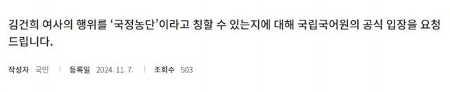 9일 뉴스1 등에 따르면 국립국어원 홈페이지 '온라인가나다' 코너에는 "김건희 여사의 행위를 '국정농단'이라고 칭할 수 있는지에 대해 국립국어원의 공식 입장을 요청한다"는 제목의 글이 올라왔다.