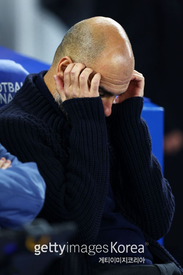과르디올라 맨시티 감독이 10일 열린 브라이턴과의 2024~25 EPL 11라운드 원정경기 중 아쉬워하고 있다. 맨시티는 이날 1-2로 패하며 공식전 4연패에 빠졌다. 과르디올라 감독은 부상 상황에 대해 언급하며 선수 부족을 언급하기도 했다.사진=게티이미지