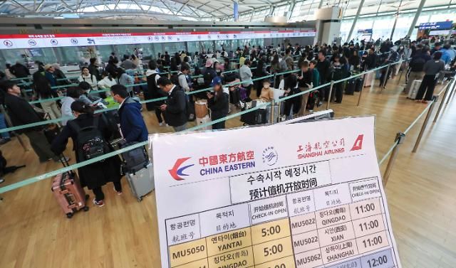对韩免签政策实施的第一天(8日)上午,仁川国际机场第一航站楼出境大厅飞往中国的航班柜台前挤满了游客。【图片来源 韩联社】