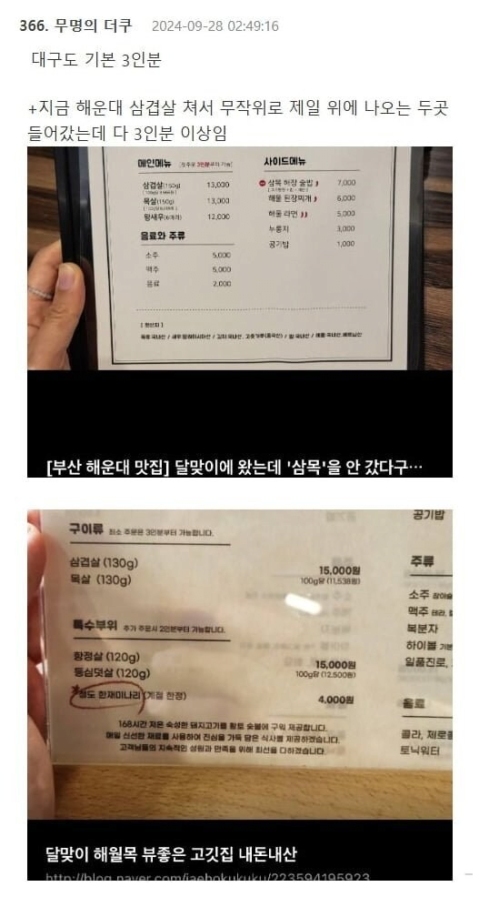 자영업자들 모여있는 네이버카페에 고기3인분논란으로 글올라옴