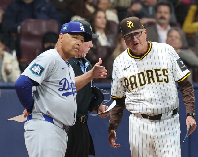 미국 메이저리그(MLB) 정규시즌 개막전인 LA 다저스와 샌디에이고 파드리스의 경기가 20일 서울 고척스카이돔에서 열렸다. 샌디에이고 마이크 실트(오른쪽) 감독과 LA 다저스 데이브 로버츠 감독이 심판과 이야기하고 있다. 고척돔=정시종 기자 capa@edaily.co.kr /2024.03.20.