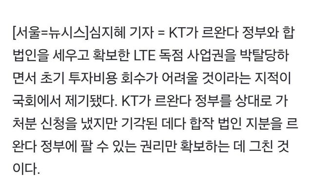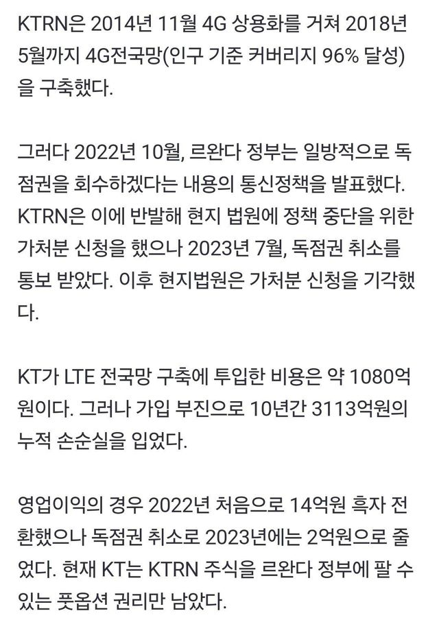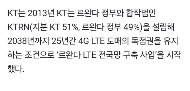 - KT가 르완다에 1천억 투자해 4G 통신망 깔아주는 대신 독점 사업권 따냄