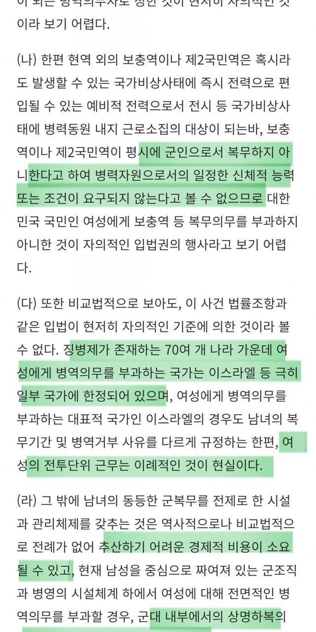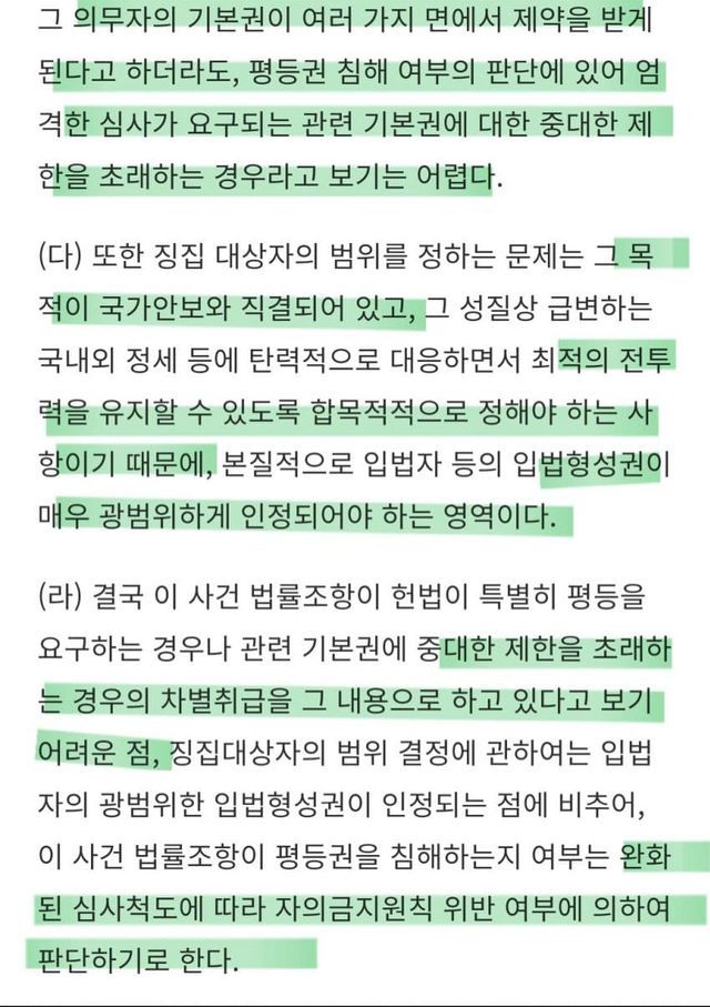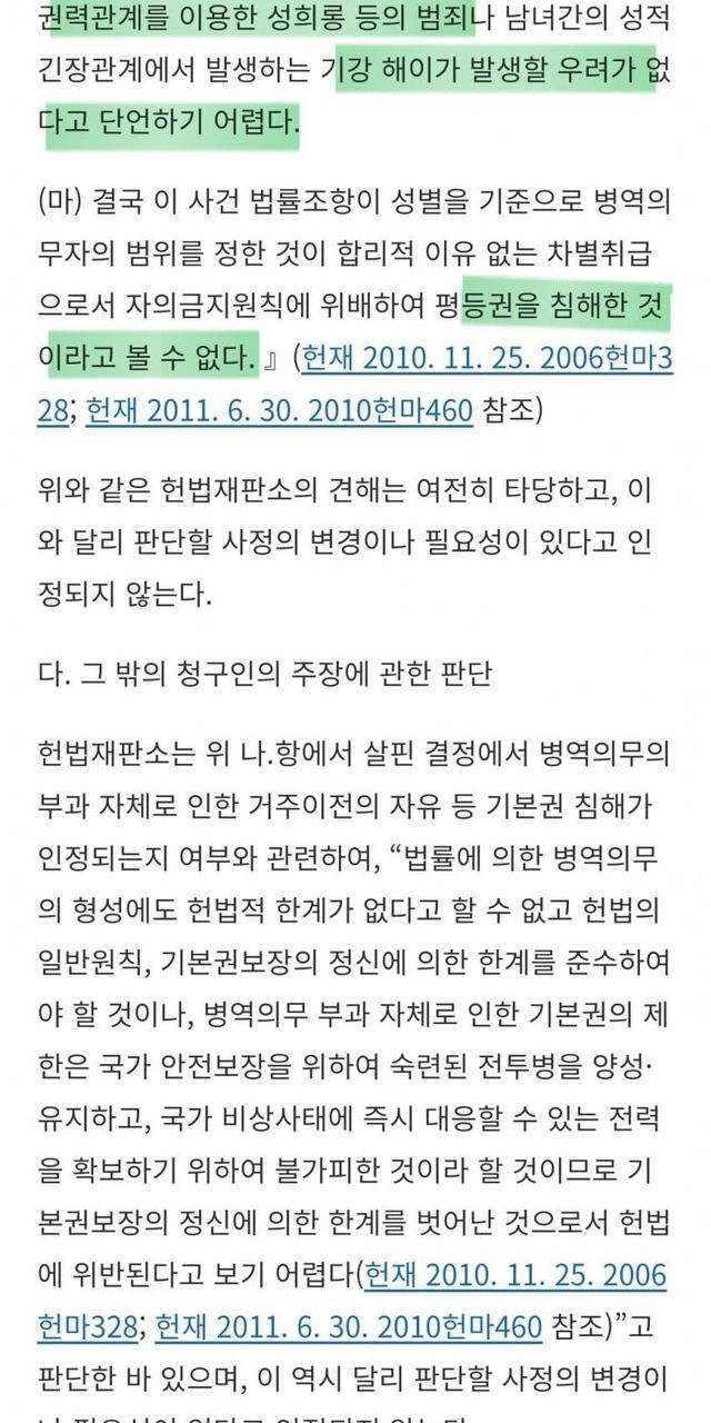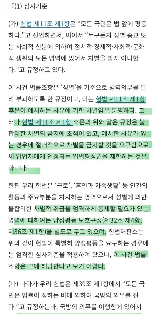 결론: 모든 국민은 성별을 이유로 부당하게 차별받지 않을 권리가 있지만 20대 남성만을 잡아다가 1년 반동안 노예로 사용하는건 그닥 중대한 기본권 침해도 아닐뿐더러 어쩔 수 없는 일이다.