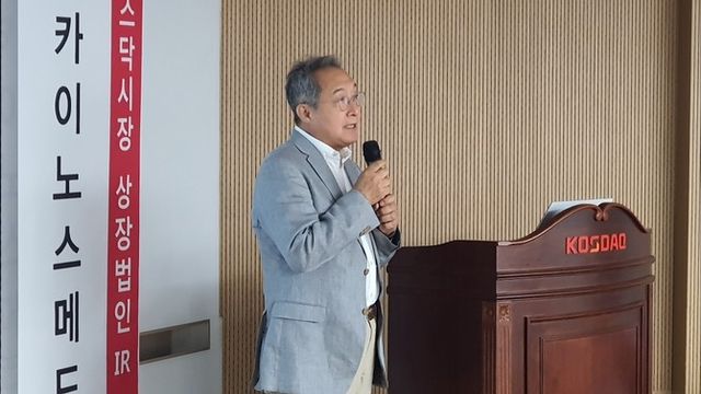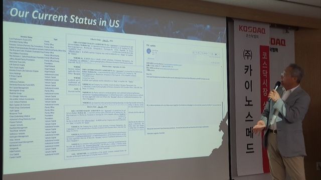 이기섭 카이노스메드 대표이사가 기업설명회를 통해 미국 내 투자자 리스트들을 공개하며 설명하고 있다. = 박기훈 기자