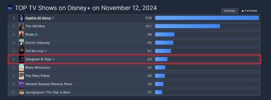전 세계 OTT 플랫폼 내 콘텐츠 시청 순위 집계 사이트인 플릭스패트롤(FlixPatrol)에 따르면 '강남 비-사이드'는 지난주 1, 2화를 첫 공개하면서 디즈니+ TV쇼 부문 월드 와이드 9위(11/8 기준)에 안착했으며, 이후 4일 만에 랭킹 6위까지 3계단 상승했다.