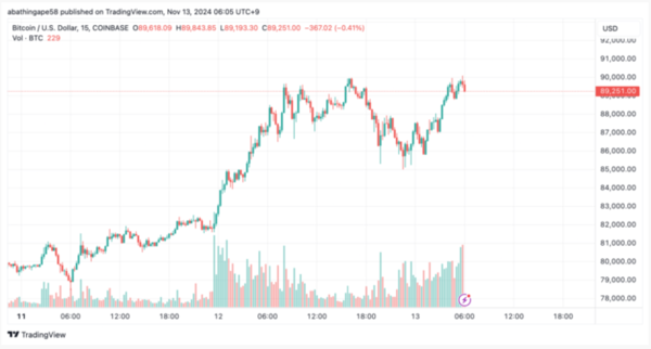 9만 달러에 돌파 여부에 이목이 쏠린 비트코인 가격은 전날 8만9560달러까지 오르며 최고치를 기록한 이후 연이어 오름세를 보였다.