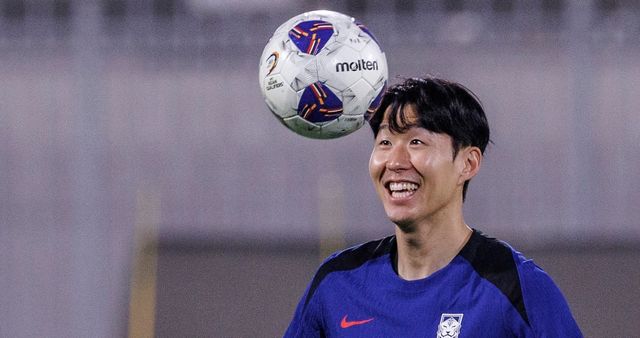 11회 연속 월드컵 본선 진출에 도전하는 한국 축구대표팀의 주장 손흥민이 지난 12일 오후(현지 시각) 쿠웨이트 압둘라 알 칼리파 스타디움에서 열린 팀 훈련에서 동료들과 훈련하다 활짝 웃고 있다. / 연합뉴스