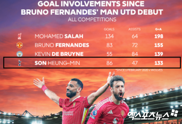 손흥민을 마지막으로 순위표는 끝난다. 페르난데스의 지난 5년을 기념하는 게시물이었지만 맨 아래 있는 손흥민의 이름도 빛난 것이다. 리스트에 포함된 것 자체로도 그의 클래스를 알려주는 지표가 됐다. 2020년부터 프리미어리그 4대 천황은 살라, 페르난데스, 더 브라위너, 손흥민임을 게시물이 알렸다.