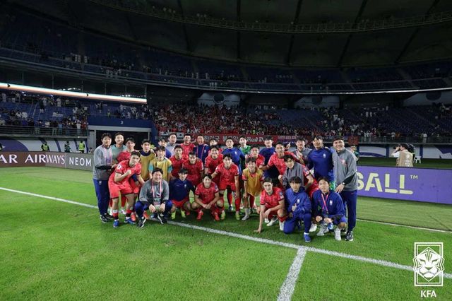 14일 오후(현지시각) 쿠웨이트 자베르 알아흐마드 국제경기장에서 열린 2026 국제축구연맹(FIFA) 북중미 월드컵 아시아 3차 예선 B조 5차전 대한민국과 쿠웨이트의 경기, 3대1 승리를 거둔 대한민국 선수단이 경기 후 기념 촬영을 하고 있다. / 대한축구협회 제공