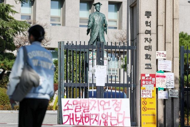 동덕여대 정문에 학교 측의 남녀공학 전환 논의를 규탄하는 학생들이 적은 항의 문구들이 붙어 있다. / 뉴스1