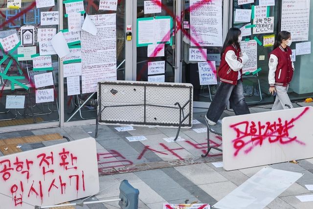 동덕여대 백주년기념관에 학생들이 학교 측의 남녀공학 전환 논의를 규탄하며 붉은색 래커 스프레이로 적은 항의 문구가 선명히 남아 있다. / 뉴스1